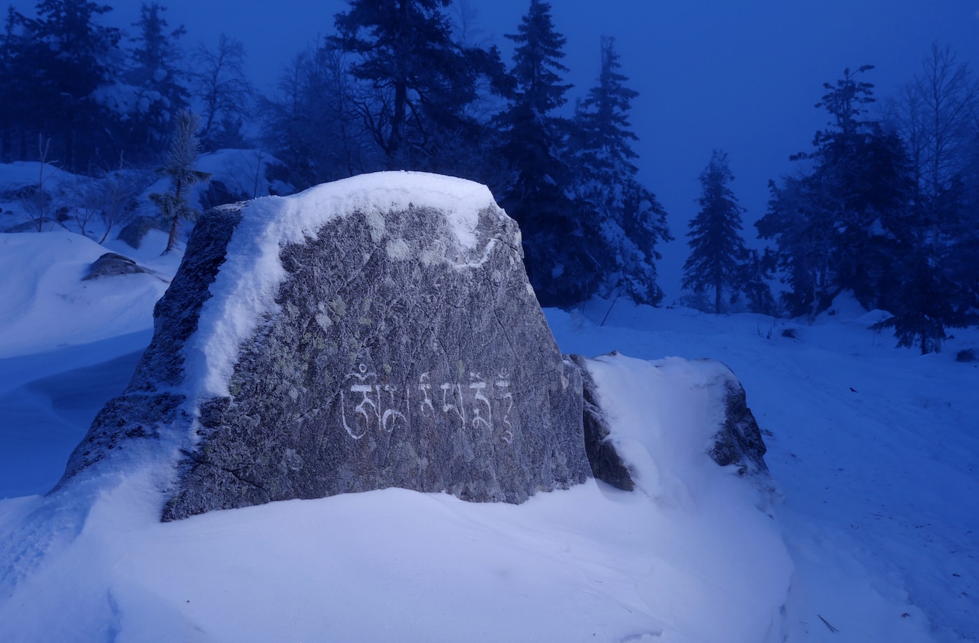 این عبارت از نیایشهای آیین بودايی به زبان سانسکریت در اواخر کوره راه نزدیک شدن به صومعه را نشان می دهد. پس از بارش برف شدید طی کردن این میسر برای رسیدن به صومعه ممکن است تا ۷ ساعت طول بکشد.