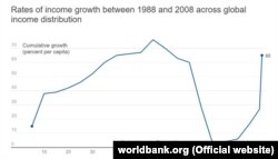 نمودار زیر که توسط برانکو میلوانیک در سال ٢٠١٣ منتشر شد، به‌خوبی نشان می‌دهد که نابرابری در دنیا چگونه کاهش یافته‌ است. در این نمودار درصد افزایش درآمد سرانه بین اتباع کشورهای مختلف در حد فاصل سال‌های ١٩٨٨تا ٢٠٠٨ نمایش داده شده است. ارقام سمت چپ مربوط به کشورهای فقیر است و ارقام سمت راست ثروتمندان را نشان می‌دهد.