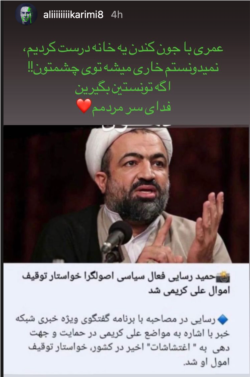 علی کریمی با انتشار استوری در اینستاگرام خود نوشته است. « عمری با جون کندن یه خانه درست کردیم نمیدونستیم خار میشه توی چشمتون!!، اگر تونستین بگیرین، فدای سر مردمم.»