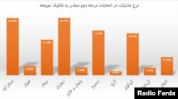 نمودار زیر نرخ مشارکت در ۱۰ حوزه انتخابیه مرحله دوم انتخابات مجلس یازدهم را نشان میدهد که در هشت استان کشور برگزار شد.