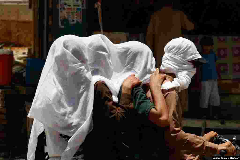 زوج سوار بر موتور در راستهٔ بازاری قدیمی در یعقوبآباد حرکت می کنند؛ افزایش دما باعث شده ایالت پنجاب مدارس را تعطیل کند و حداقل ۲۶ میلیون دانشآموز به مدرسه نروند.