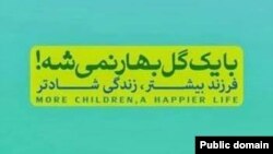 يک مرد، چهار پسربچه و دختربچهای که روسری بر سر دارد سوار بر دوچرخهاند با اين شعار که «با يک گل بهار نميشه» و البته «فرزند بيشتر، زندگي شادتر».