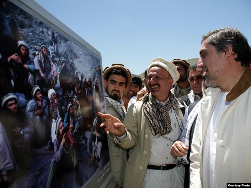 رضا دقتی (وسط) در کنار عبد الله عبد الله -رقیب انتخاباتی کرزای- در افغانستان در جریان برپایی نمایشگاه ویژه و دائمی برای شاه مسعود
