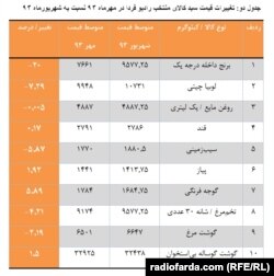 بررسی تغییرات قیمتی سبد کالای منتخب رادیو فردا نیز نشان می‌دهد که متوسط تغییرات قیمتی این سبد ده قلم کالایی در مهرماه امسال در مقایسه با شهریورماه، با کاهشی سه درصدی، همراه شد.
