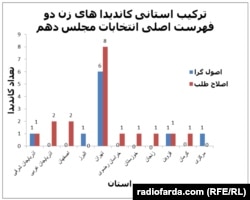 در بهترین حالت ممکن است ۲۰ زن وارد مجلس دهم شوند که احتمال وقوع چنین سناریویی بالا نیست. این امکان نیز در خور تامل است که رکورد مجلس پنجم با ۱۴ کاندیدا تکرار شود و یا اندکی افزایش یابد. نمودار زیر ترکیب استانی کاندیدا‌های زن در دو فهرست ائتلاف بزرگ اصول گرایان و ائتلاف اصلاح طلبان و اعتدالی را به نمایش می‌گذارد.