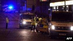 نیروهای پلیس در اطراف محل انفجار؛ بنا بر گزارشها صدها نیروهای امنیتی و ضدتروریستی بریتانیا در خیابانهای منچستر مستقر شدهاند.