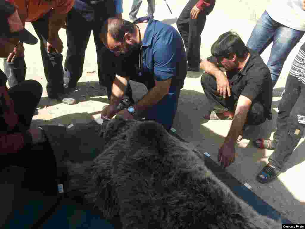 ایمان معماریان در حال معاینه خرس قهوه ای