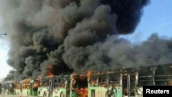 خبرگزاری رویترز به نقل از تلویزیون دولتی سوریه و دیده‌بان حقوق بشر سوریه گزارش داد که چندین اتوبوس و آمبولانس اعزامی برای تخلیه ساکنان دو روستای کفریا و الفوعه در ورودی این دو روستا در استان ادلب که تحت کنترل شورشیان قرار دارد، به آتش کشیده شده‌اند.
