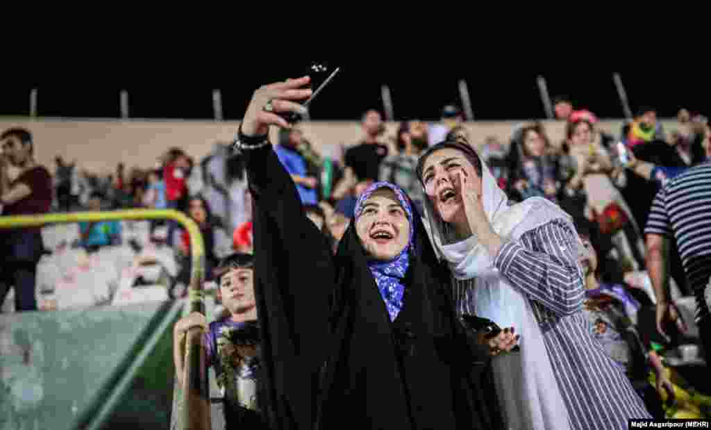 زنان و مردان حامی تیم ملی فوتبال ایران، در حال تماشای بازی روی پرده در استادیوم آزادی